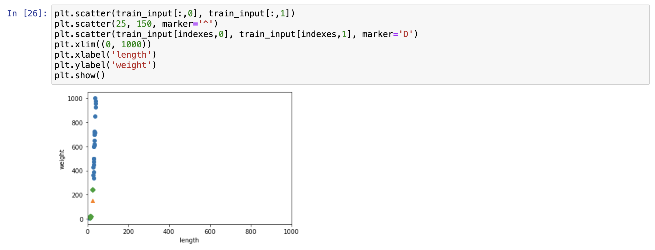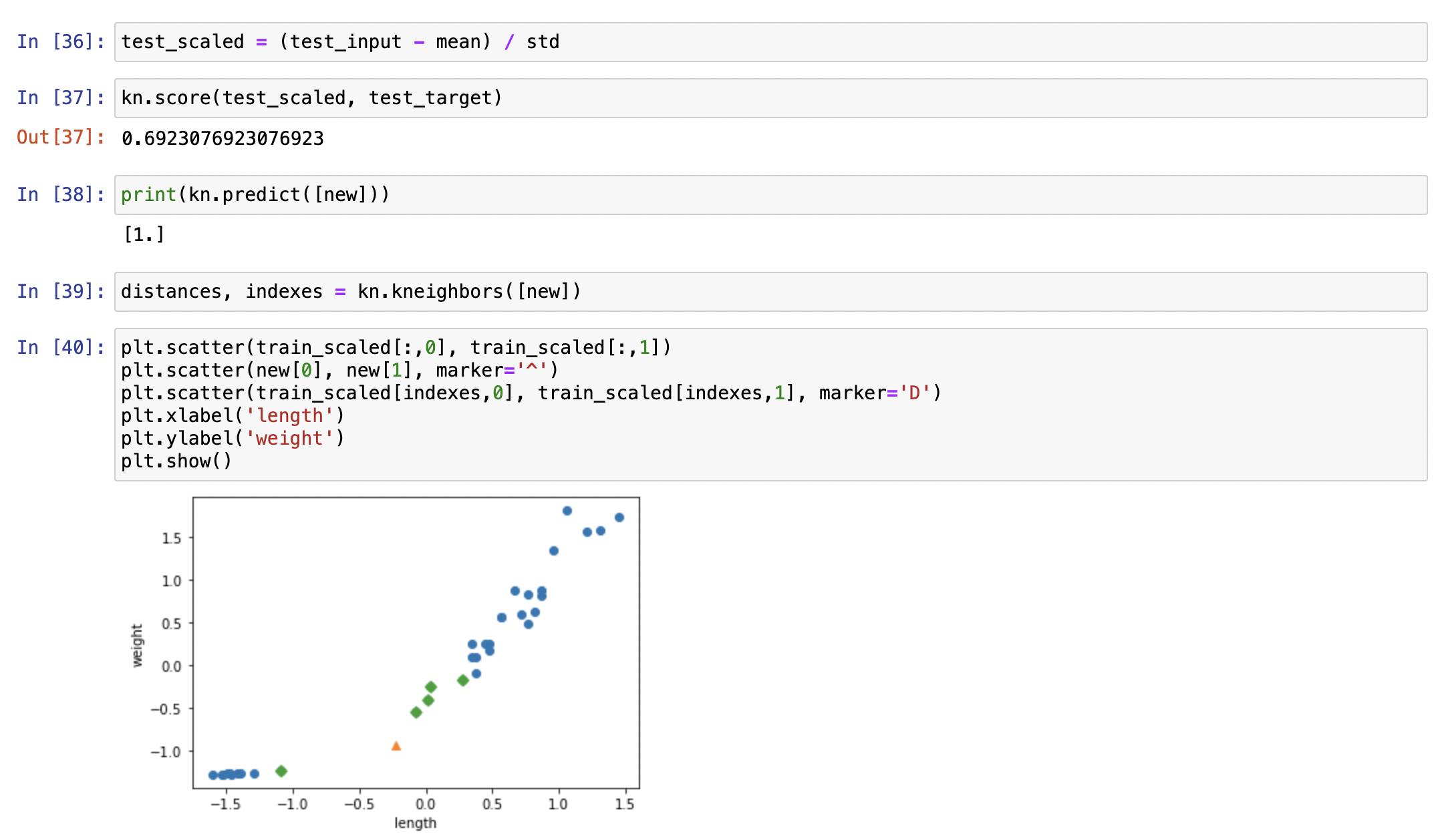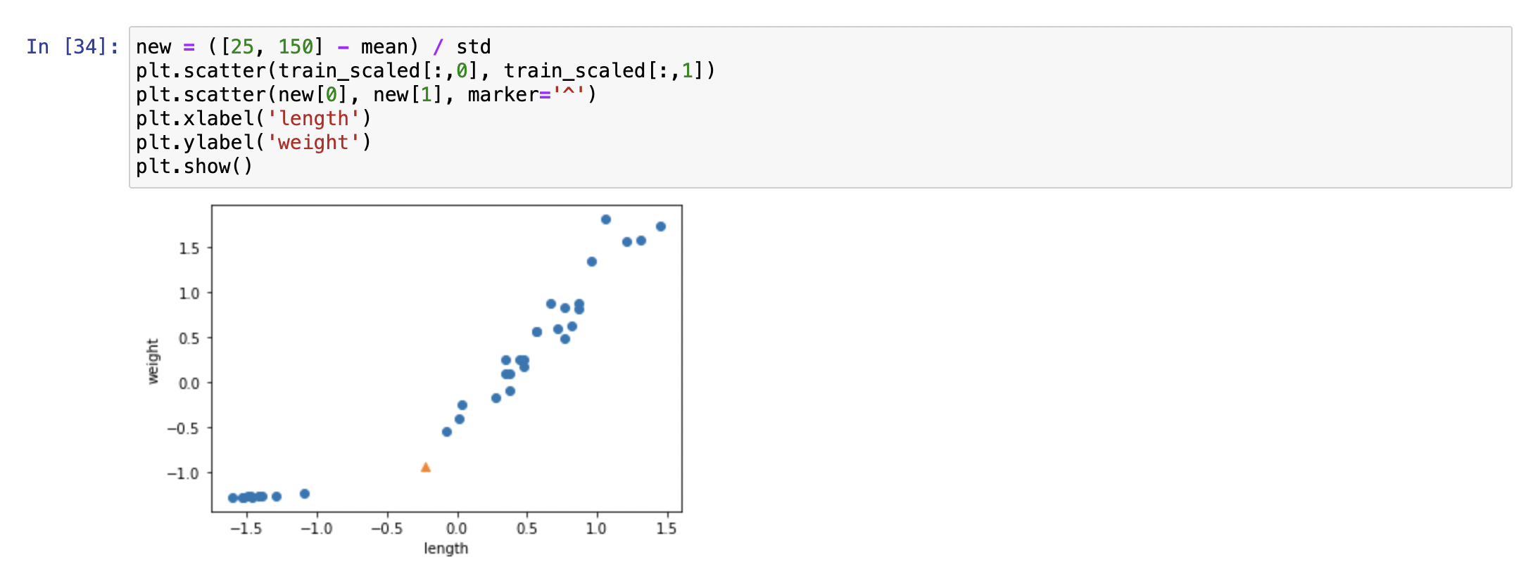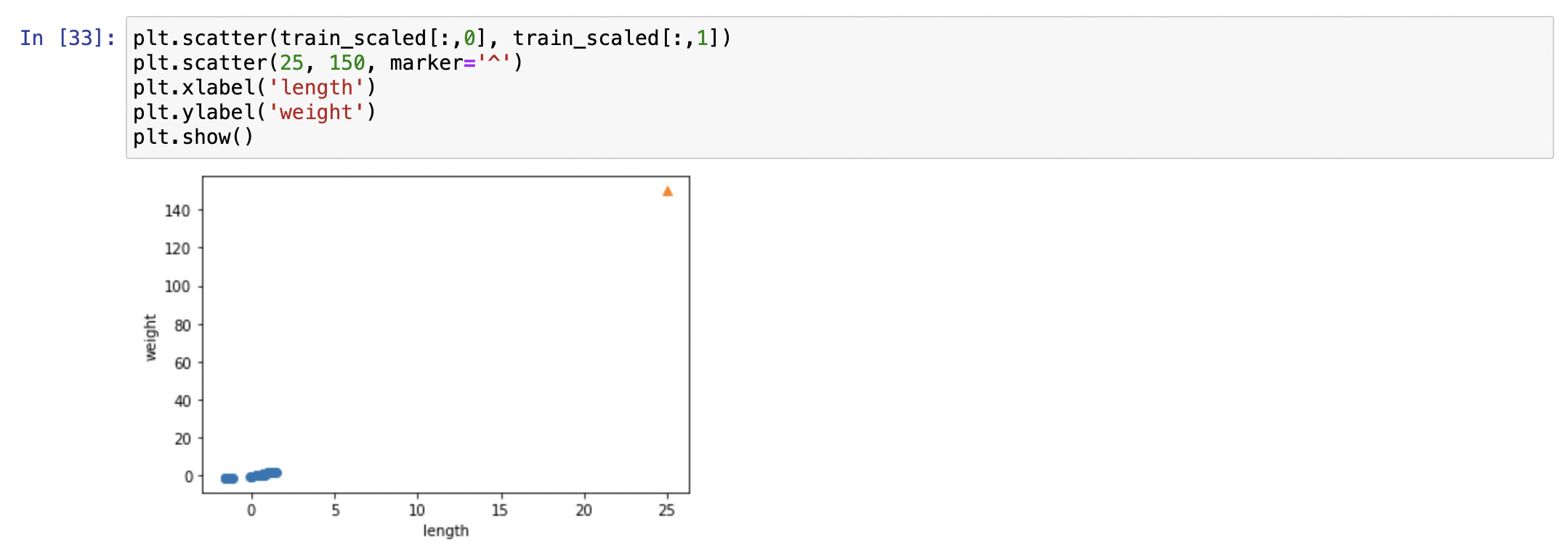 ✔︎ !주의! : 훈련 세트의 기준으로 테스트 세트를 변환해야 같은 스케일로 산점도를 그릴 수 있다.