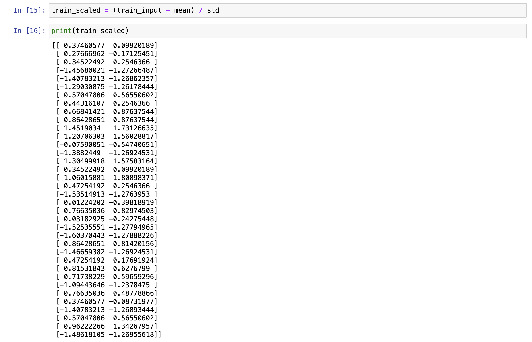 ✔︎ 훈련 세트의 값의 스케일을 변환해주었기에 범위가 달라졌다.