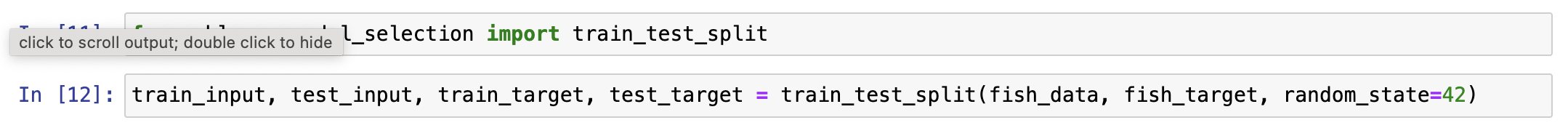 ✔︎ train_test_split() : 전달되는 리스트나 배열을 비율에 맞게 훈련 세트와 테스트 세트로 나눈다.