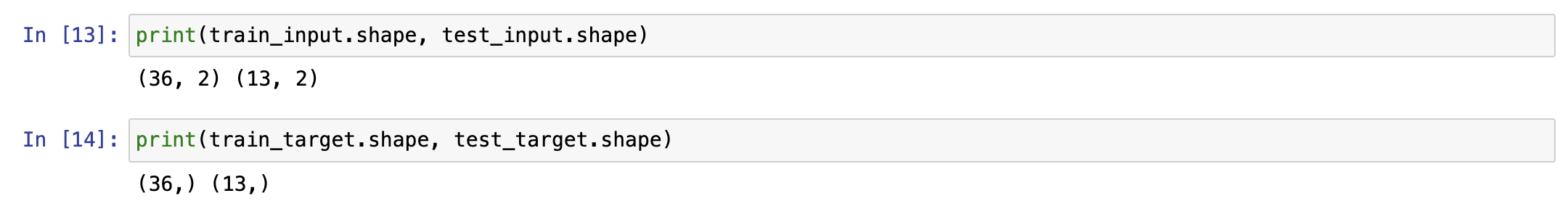 ✔︎ 훈련 데이터, 테스트 데이터 = 36, 13
