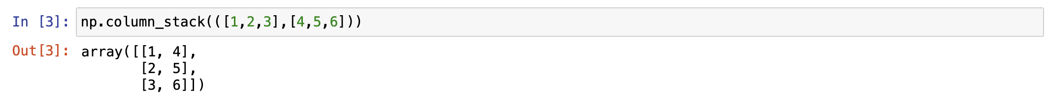 ✔︎ column_stack() : 전달받은 리스트를 일렬로 세운 다음 차례대로 나란히 연결한다.