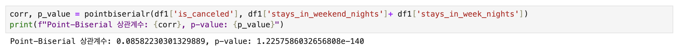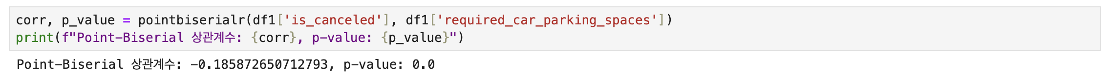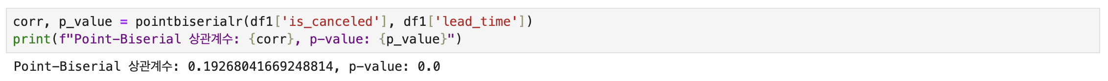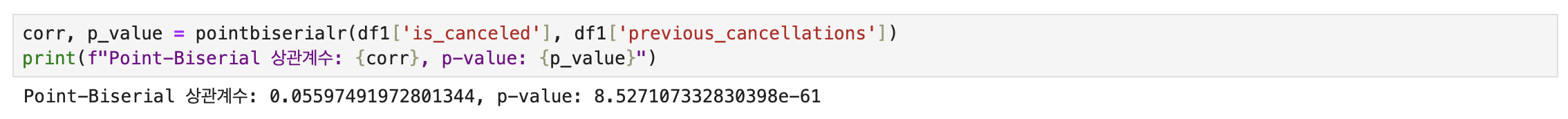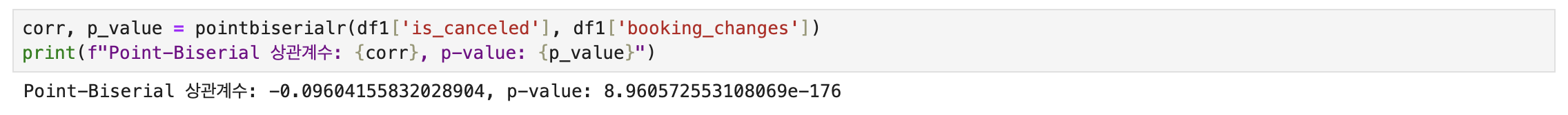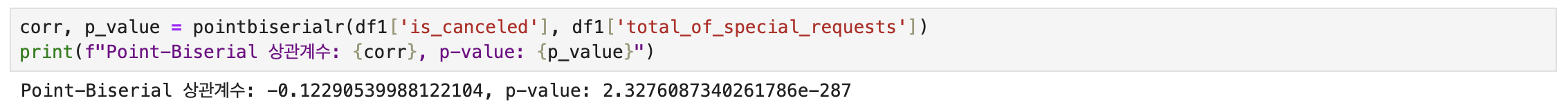 : Point-Biserial 상관계수를 사용한 이유는 이진 변수(is_canceled)와 연속형 변수(lead_time, total_of_special_requests 등) 사이의 상관관계를 정확하게 측정하고 해석하기 위해서 Point-Biserial 상관계수를 선택하였다.
