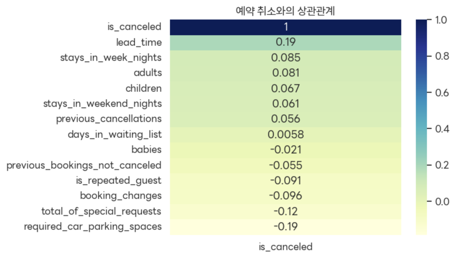 : is_canceled과의 상관관계만 집중적으로 분석하기 위해 전체 상관관계가 아닌 특정 변수(is_canceled)만 추출.