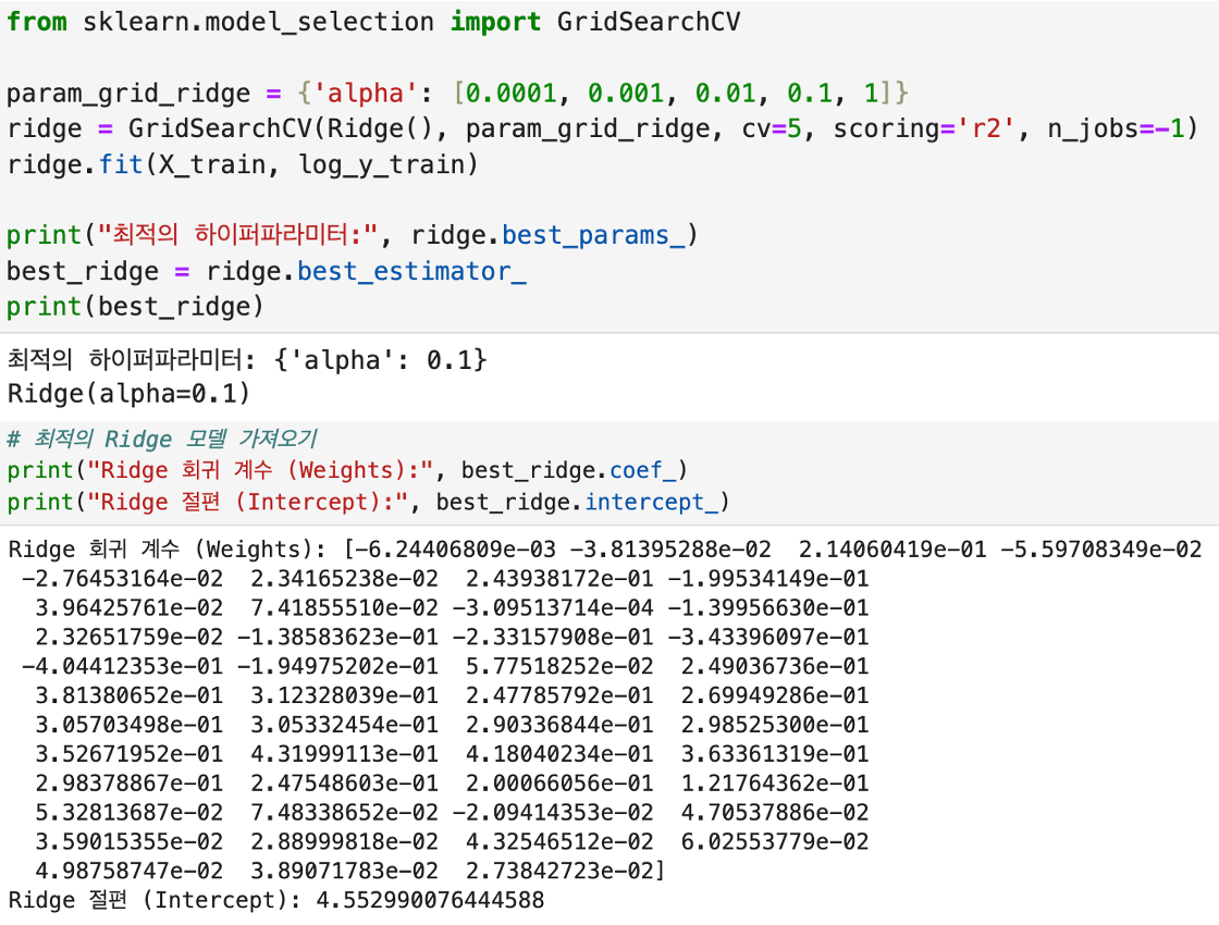 : best_ridge.coef_: 최적 모델의 가중치 (Feature Weights)