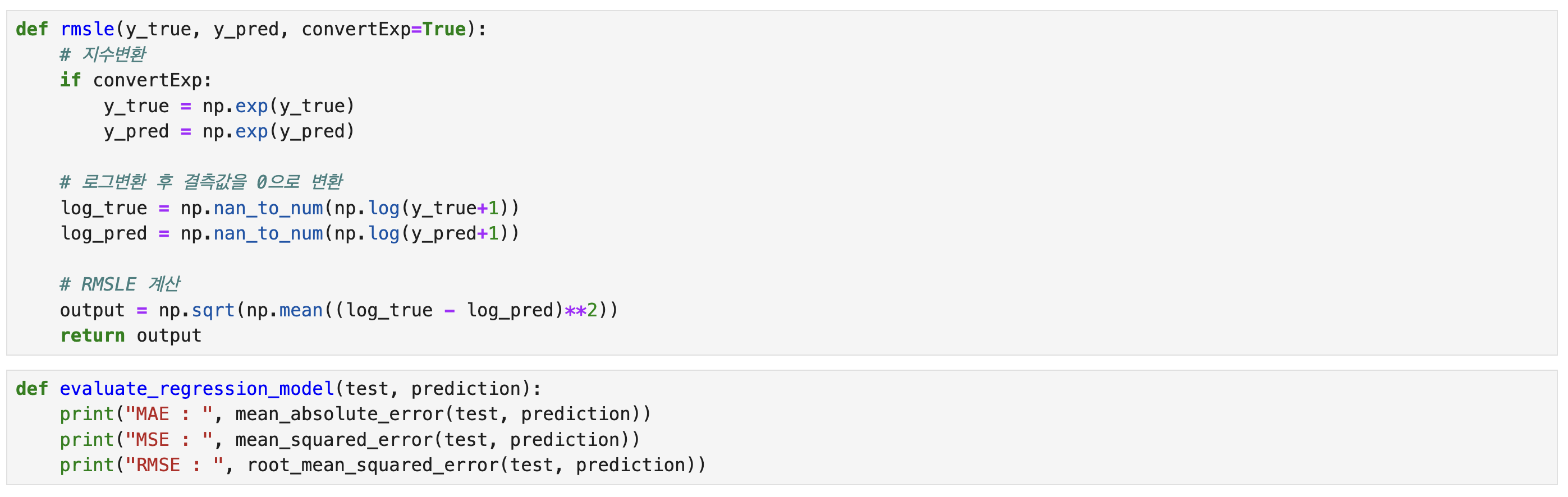 ✔ RMSLE : 로그 변환을 사용한 RMSE로, 상대적 오차를 평가할 때 유용