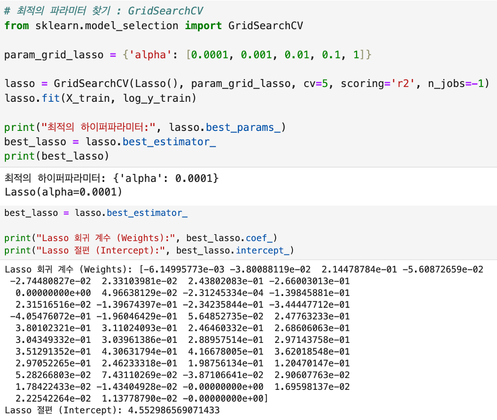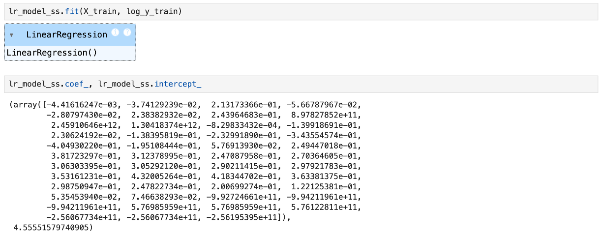 - LinearRegression() 모델을 X_train(훈련 데이터)과 log_y_train(로그 변환된