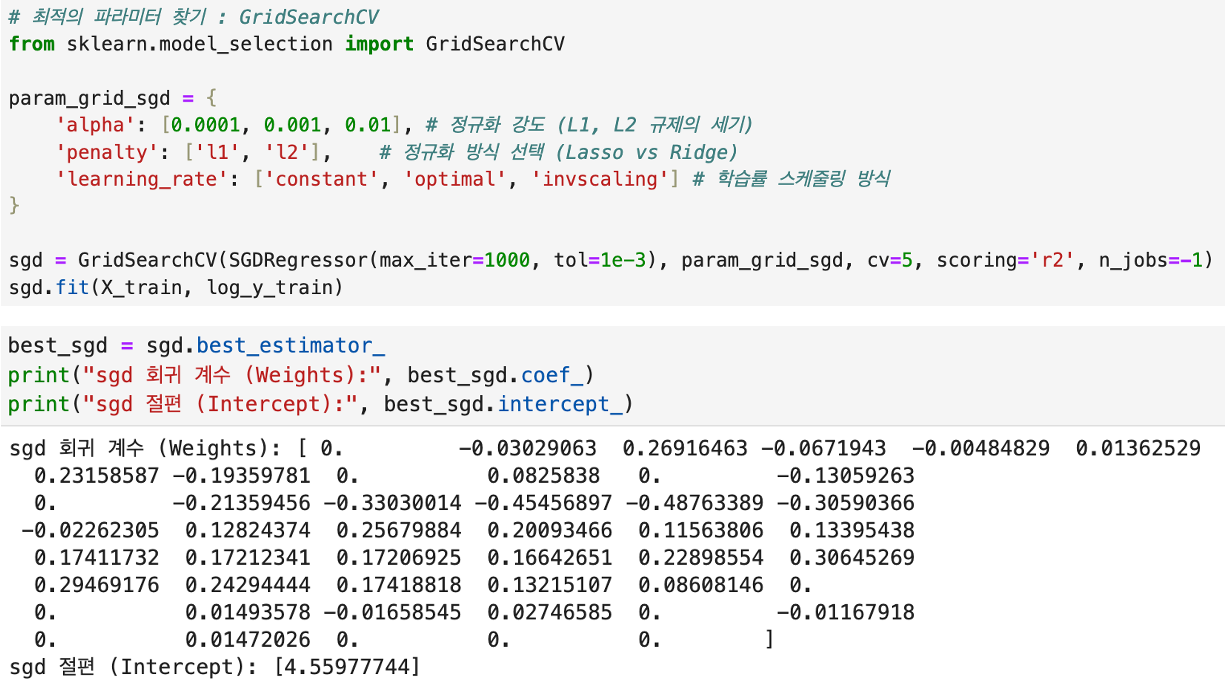 ✔ 회귀 계수(coef_) 및 절편(intercept_) 출력