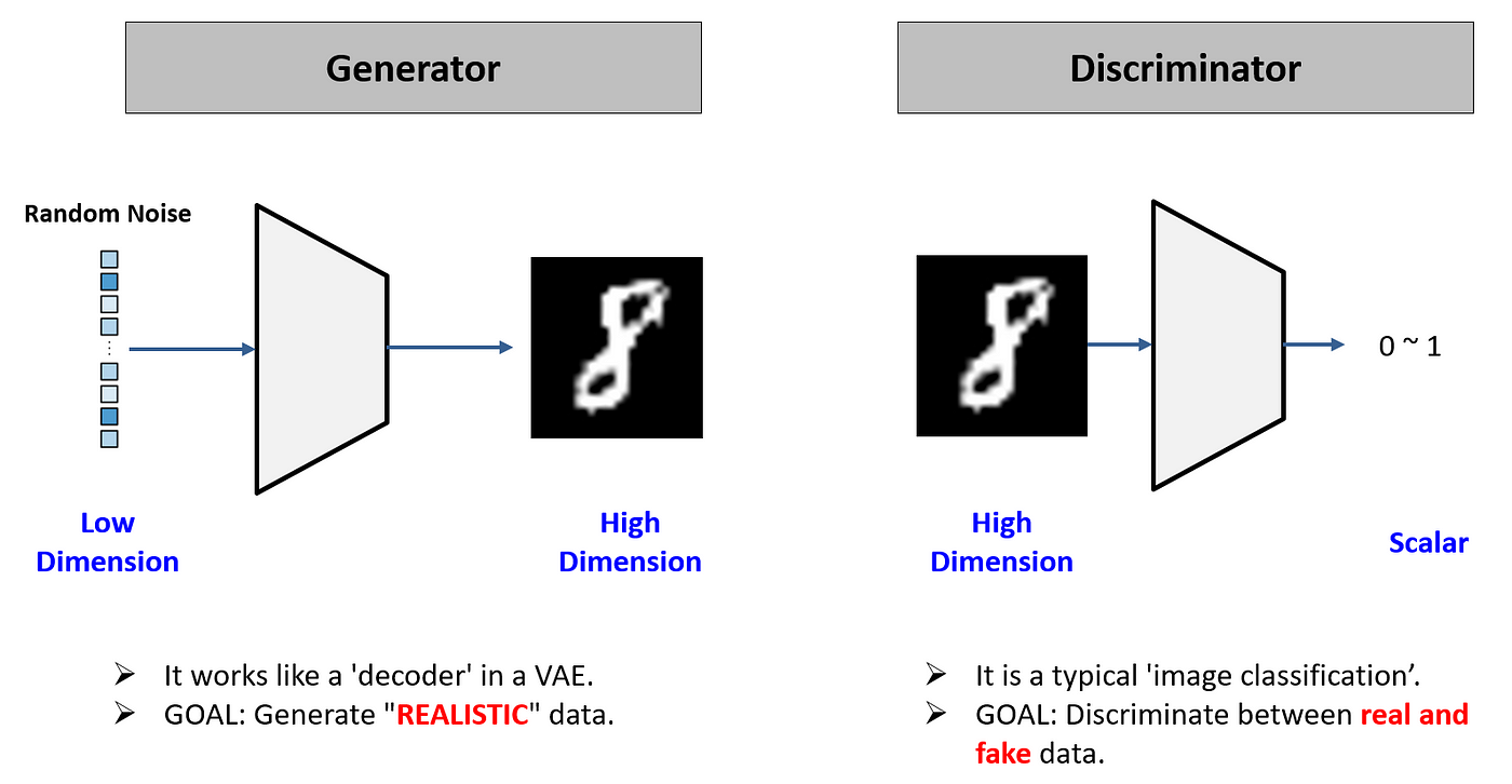 - 생성자(Generator) : 무작위 노이즈로부터 현실적인 데이터를 생성하려고 시도한다.