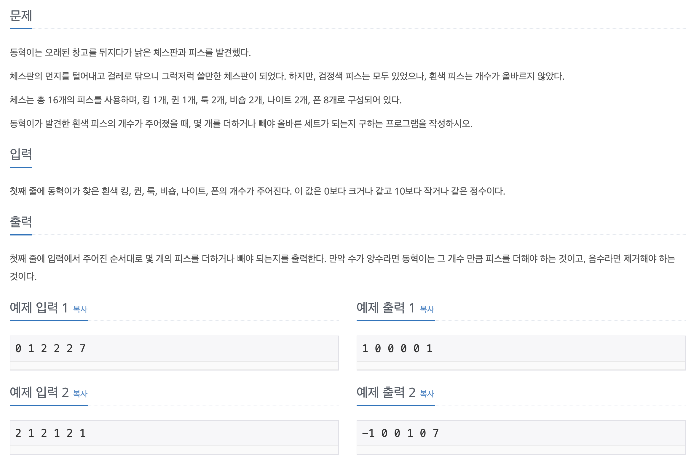 # 체스 = 총 16개의 피스 (킹 1개, 퀸 1개, 룩 2개, 비숍 2개, 나이트 2개, 폰 8개로 구성)